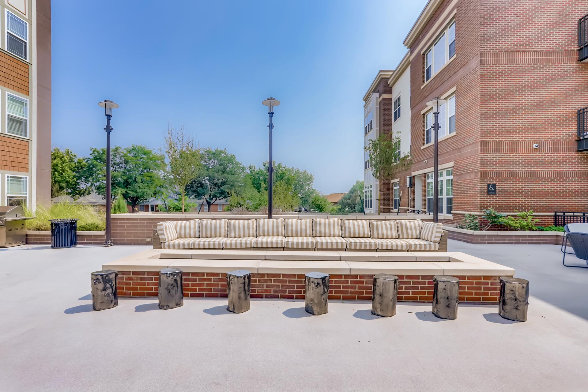 Centre Court apartments outdoor lounge with plush seating, fire pit, and dining tables with umbrellas.